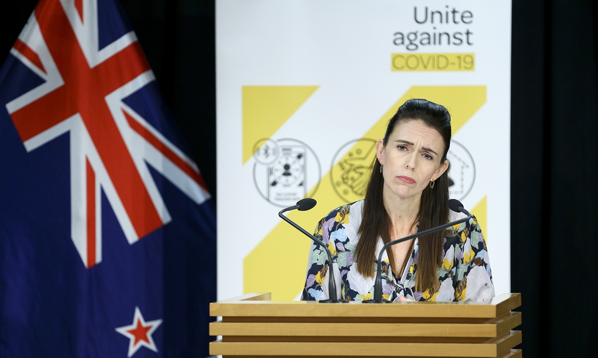 Jacinda Ardern, New Zealand's Prime Minister, looks on during a press conference at Parliament on Sunday in Wellington, New Zealand. Auckland has entered Level 3 lockdown for the next seven days after a new COVID-19 case was detected in the community on Saturday. The rest of New Zealand will be subject to Level 2 restrictions for a week. Photo: VCG